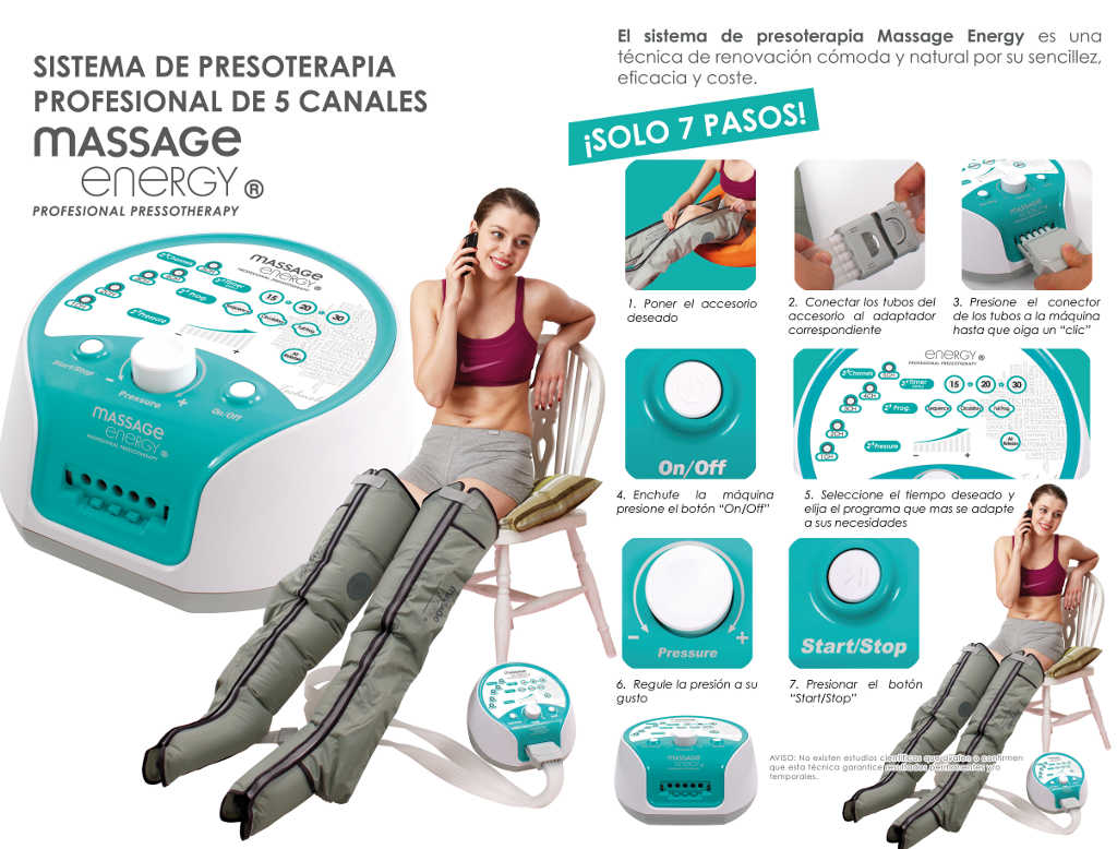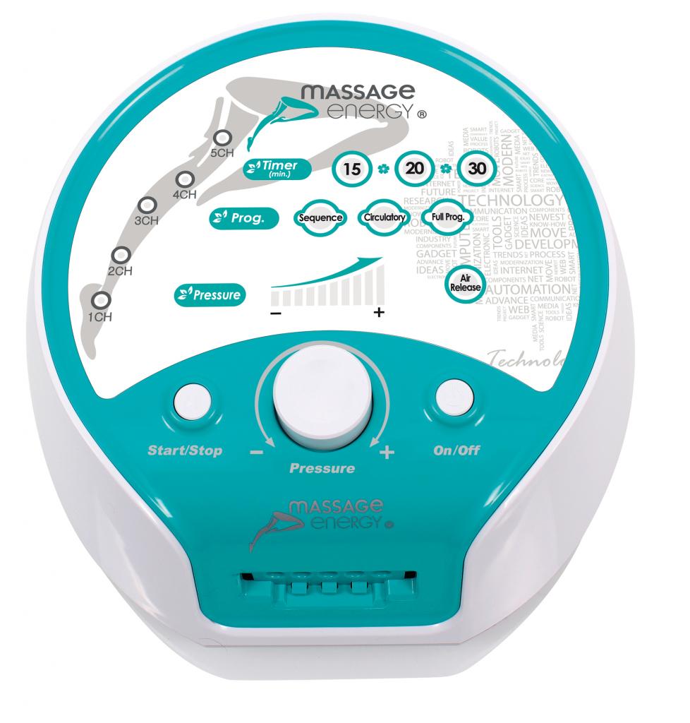 El sistema de presoterapia Massage energy es un sistema de compresión de 5 canales que generan una presión positiva de forma ascendente. Incorpora tres programas diferentes que dan la posibilidad de usar la presoterapia según sus necesidades.